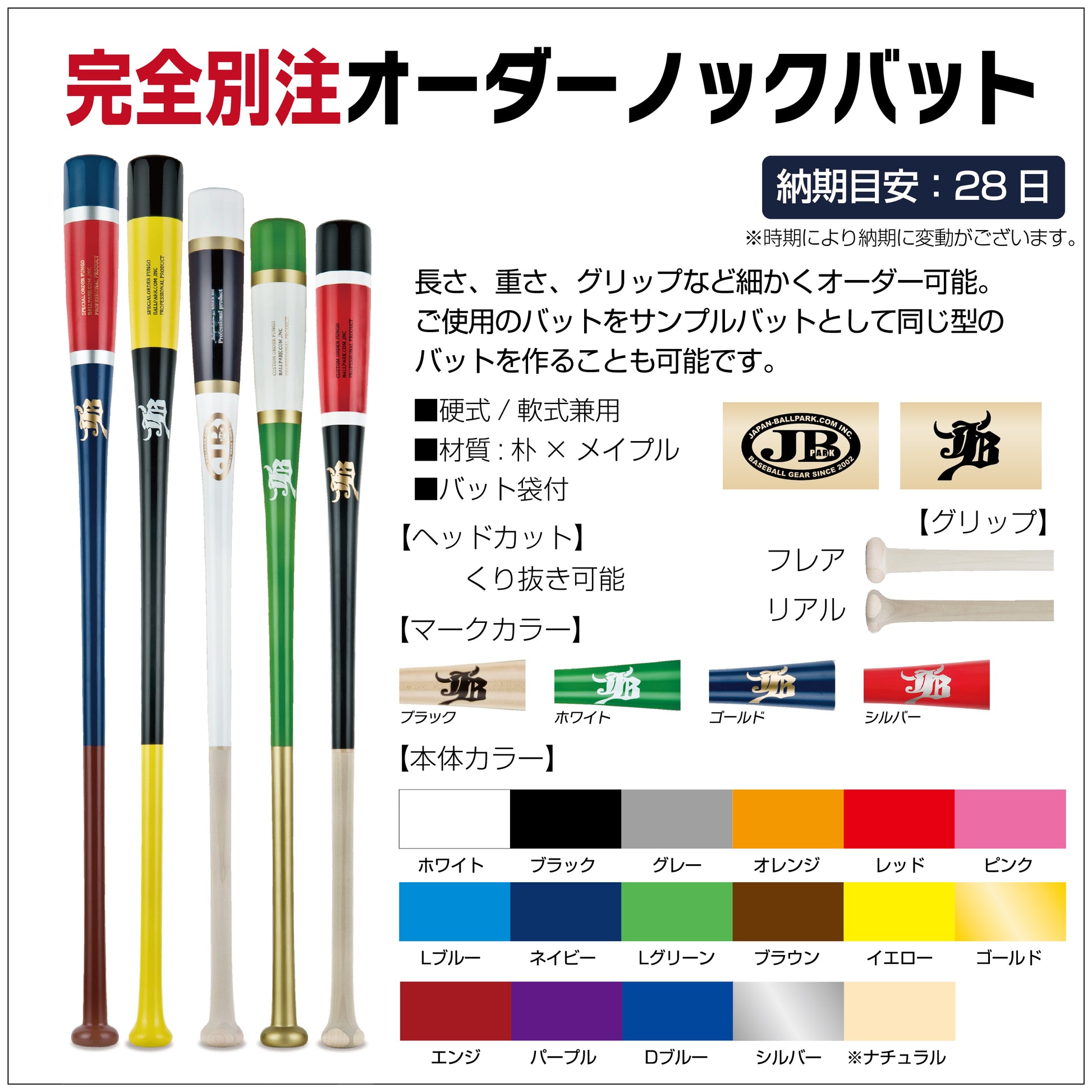 It is a bat that can be finely ordered based on the same mold (length, weight, grip size, etc.) with the bat currently in use as the sample bat. If there is no sample bat, we will make it based on the model selected from JB knock butt 2 model 4 size.