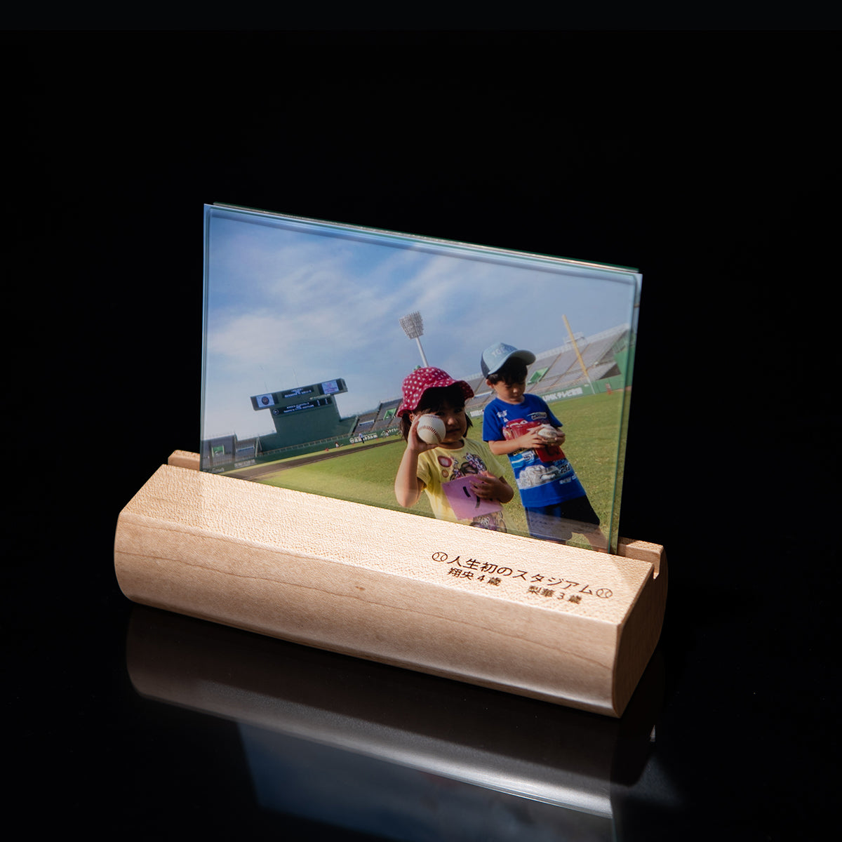 バットとして削ったが規格を満たさない材や折れたバットを再加工したフォトスタンド。左から右にかけ若干太くなる形状を生かした製品です。
