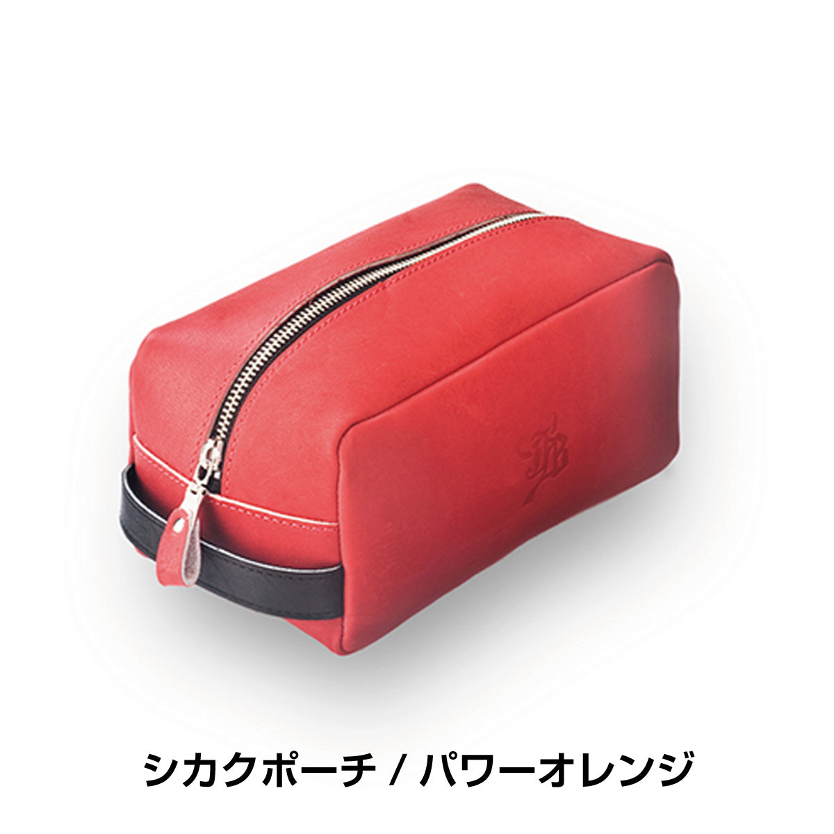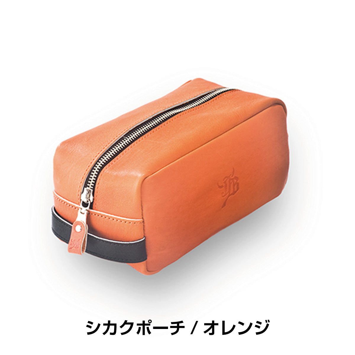 Baseball leather で仕上げたまるごと革ポーチ。ワイルドな内装布無し構造。小物・道具入れに最適。オレンジorパワーオレンジからお選び頂けます。
