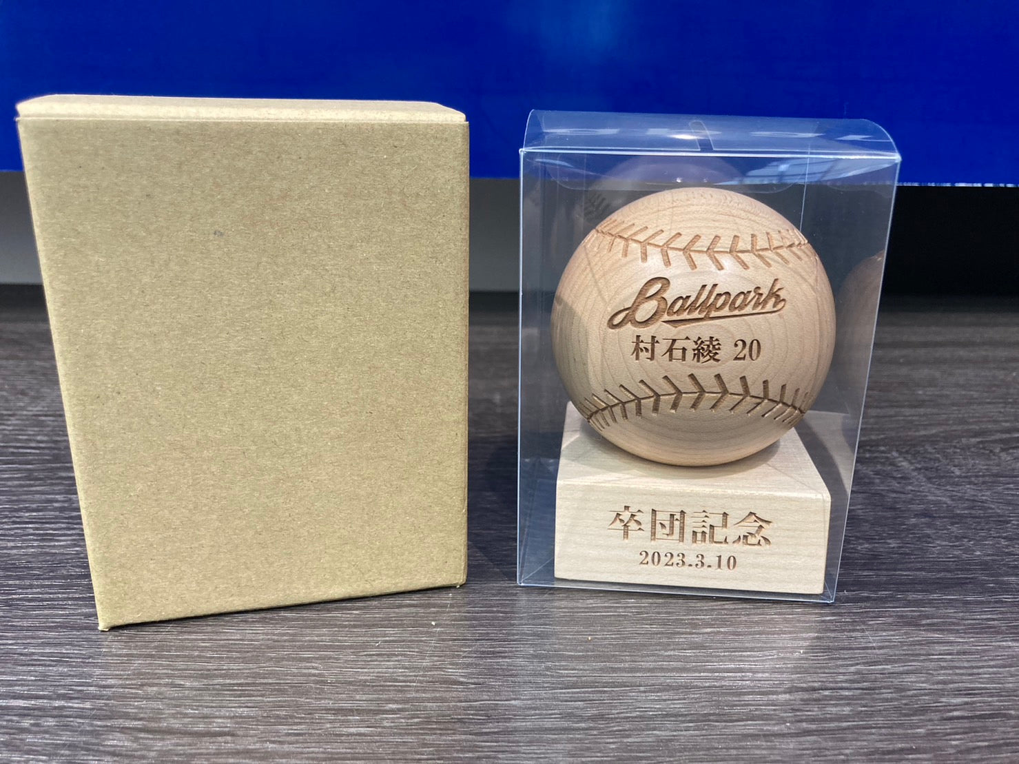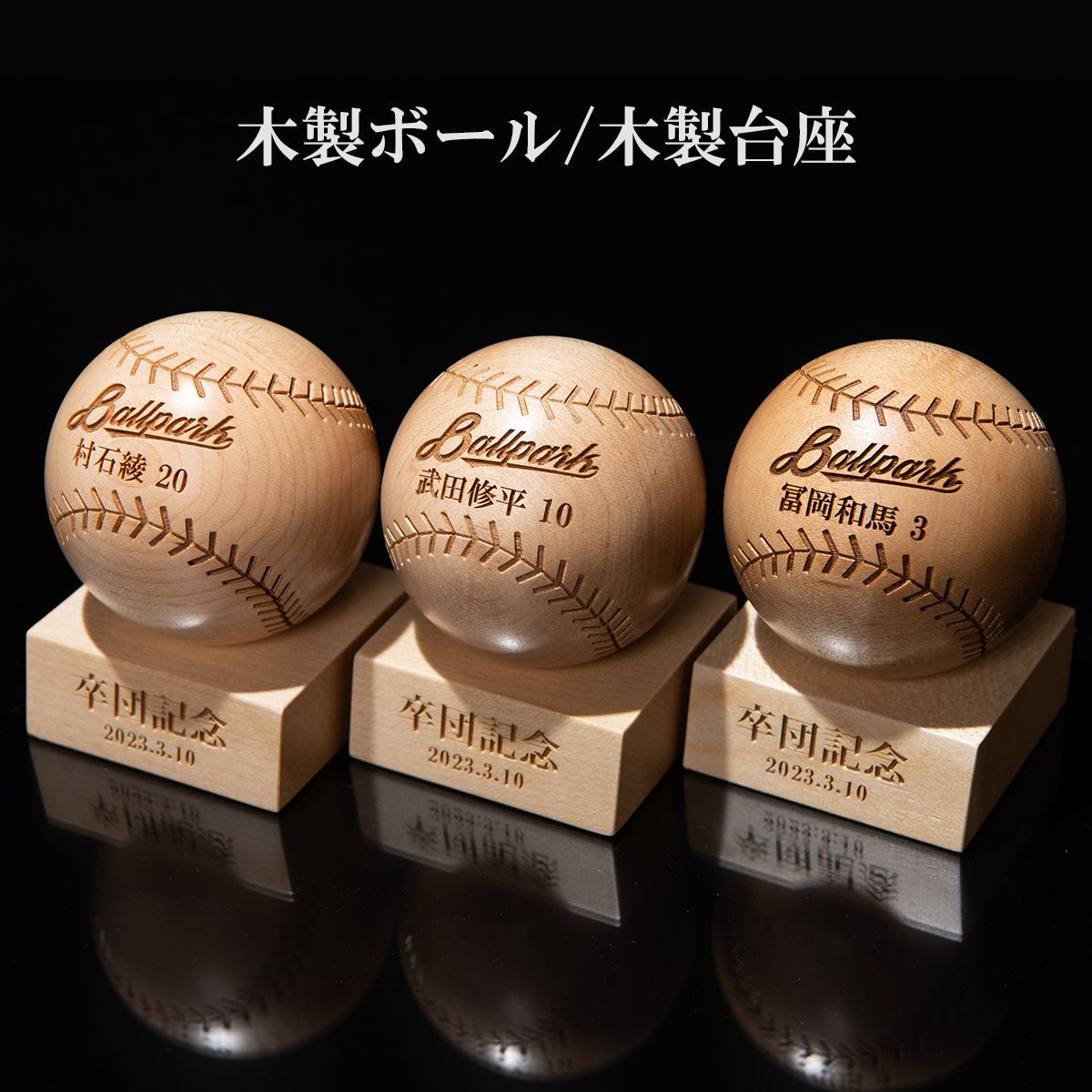 ボールと台座にそれぞれお好きな言葉、マークを刻印いたします。